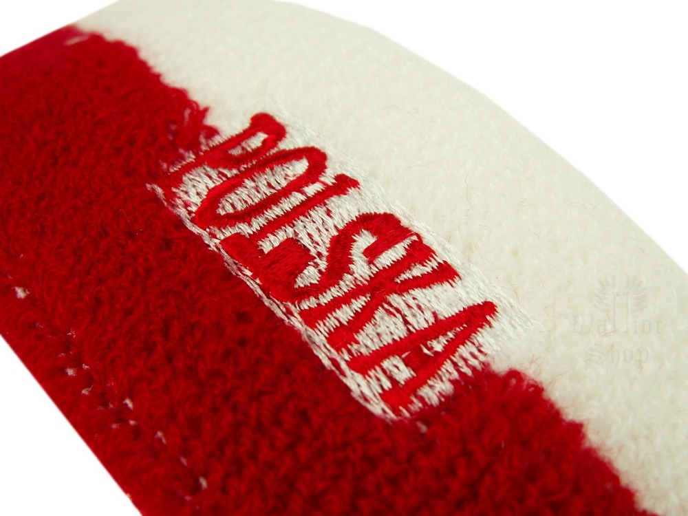 Opaska na głowę Polska z aplikacjom wykonaną haftem. Frotka wykonana jest w 100% z bawełny, posiada elastyczny ściągacz który zapobiega spadaniu frotki z głowy. Jeden z atrybutów najwierniejszych kibiców oraz sportowców reprezentujących barwy naszej Ojczyzny.