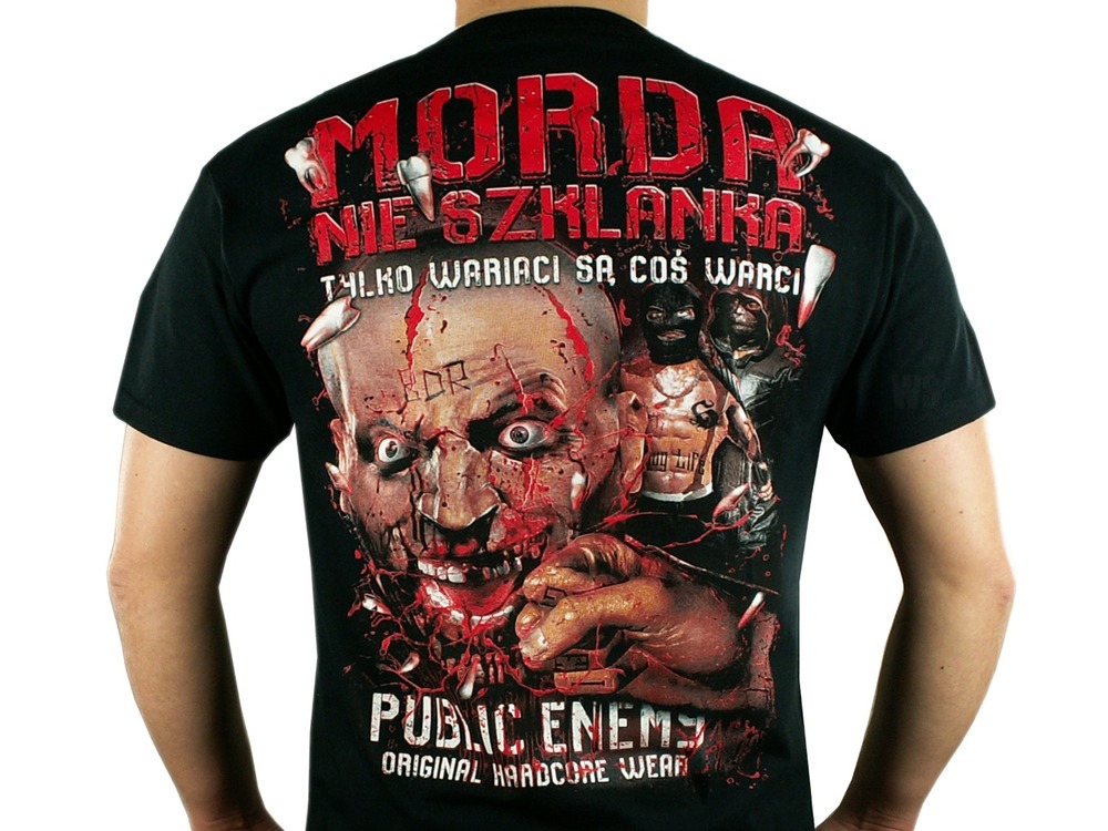 Nowość! T-shirt ulicznej marki Public Enemy Morda nie szklanka. Kupując zyskujesz solidną koszulkę wykonaną w 100% z bawełny. Nadruk wykonany sitodrukiem, mocny i odporny na pranie i warunki atmosferyczne. T-shirt jasno określi Twój stosunek do panującego systemu oraz zasady jakie kierują Twoim życiem. Gramatura koszulki 190 g/m. Hardcorowa jakość i styl. Nowa kolekcja - polecamy!